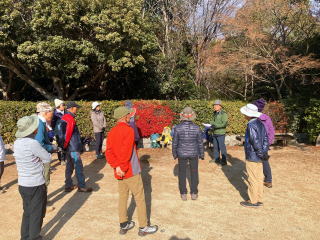 | 美しい並木の中央口、先ずは本日の説明から | 準備体操後、日本庭園、国際庭園を巡る |